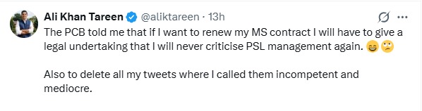 “The PCB told me that if I want to renew my MS [Multan Sultans] contract I will have to give a legal undertaking that I will never criticise PSL management again. Also to delete all my tweets where I called them incompetent and mediocre,” he wrote.