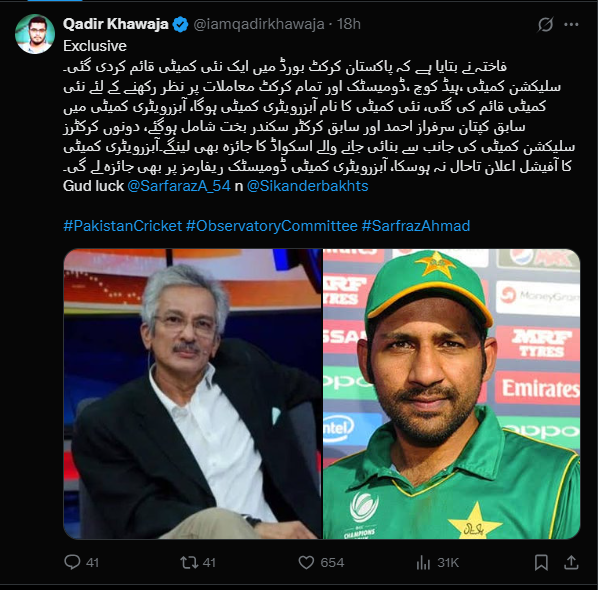 Former Pakistan cricketers Sikandar Bakht and Sarfaraz Ahmed will reportedly lead the committee, which will also review and address issues within the domestic cricket circuit.