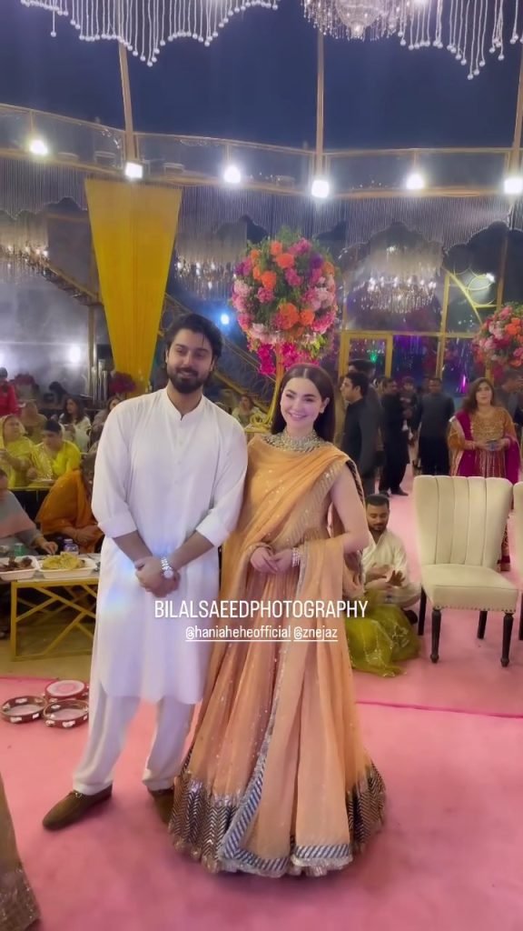 With the summer wedding season starting out, celebrities like Zaviyar Nauman Ijaz and Hania Aamir were spotted enjoying themselves at a recent event. While attending the festivities, Zaviyar showcased his Bhangra skills during the mehendi ceremony. Zaviyar turned heads in an off-white salwar kameez, while Hania stole the show in a stunning orange frock.