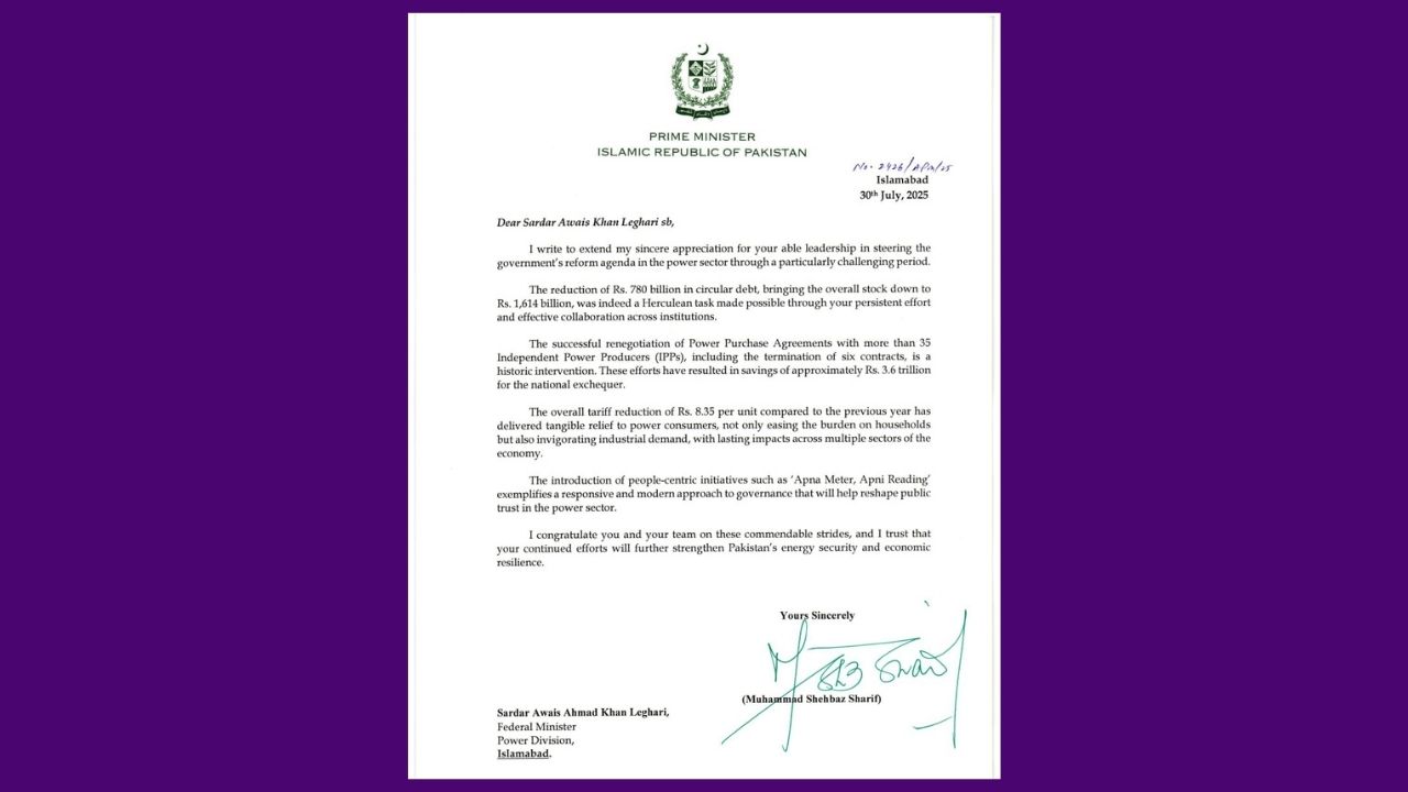 The Prime Minister’s letter of recognition praises the Power Division’s performance, highlighting a combination of fiscal discipline, structural reforms, and people-centric governance under Leghari’s stewardship.