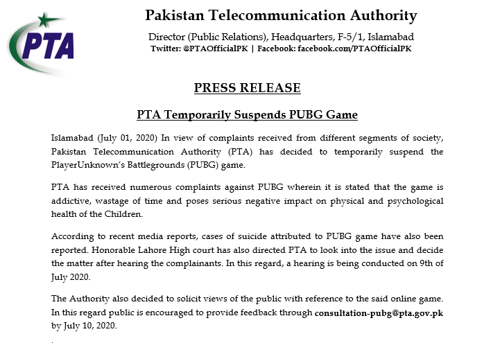 PTA has also urged people to share their opinion and give their feedback on the issue at consultation-pubg@pta.gov.pk by July 10, 2020.