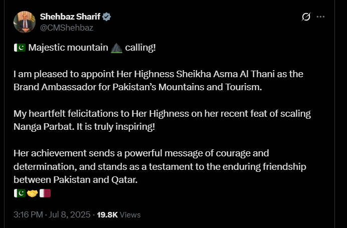 Taking to the social media platform X, the prime minister wrote, “I am pleased to appoint Her Highness Sheikha Asma Al Thani as the Brand Ambassador for Pakistan’s Mountains and Tourism. My heartfelt felicitations to Her Highness on her recent feat of scaling Nanga Parbat. It is truly inspiring!”