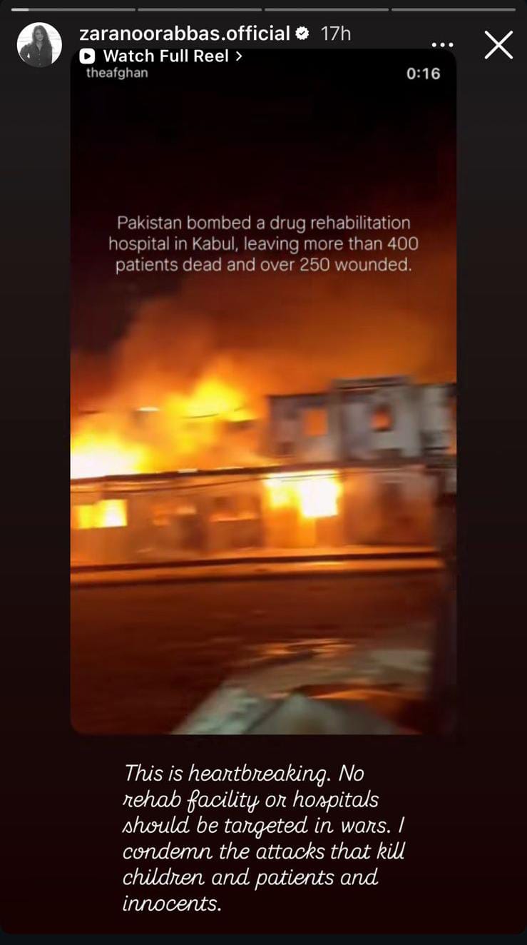 “This is heartbreaking. No rehab facility or hospitals should be targeted in wars. I condemn the attacks that kill children and patients and innocents,” she wrote while sharing The Afghan’s Instagram post wherein it was claimed that dozens were killed and several others injured when Pakistan bombed a health facility across the border.