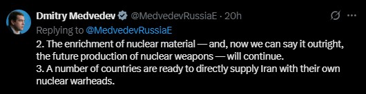 The confusion stems from the former Russian Prime Minister (PM) and Deputy Chair of the Security Council of the Russian Federation, Dmitry Medvedev's 10-part threads on X (formerly Twitter). In one of his tweets, Medvedev wrote, “A number of countries are ready to directly supply Iran with their own nuclear warheads.”