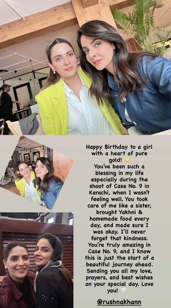 Pakistan’s most talented actress Saba Qamar took to Instagram to wish her co-star Rushna Khan a heartfelt happy birthday, expressing deep gratitude for her kindness and praising her performance in the drama Case No. 9.