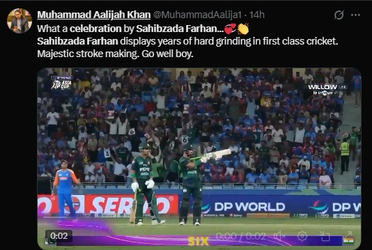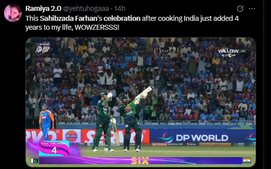 “SAHIBZADA FARHAN TEARING APART INDIAN BOWLERS. WHAT A KILLER CELEBRATION,” wrote another netizen.