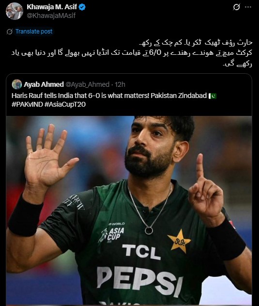 Reacting to the fast bowler's gestures, Defence Minister Khawaja Asif wrote that India would never forget the Pakistan Air Force’s (PAF) 6-0 victory during Marka-e-Haq.