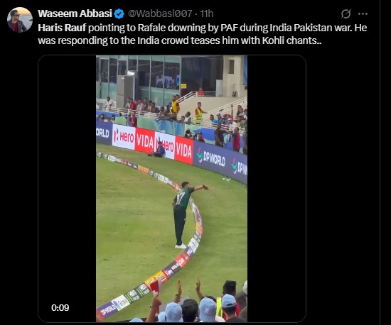 “Haris Rauf pointing to Rafale downing by PAF during the India-Pakistan war. He was responding to the India crowd teasing him with Kohli chants,” journalist Waseem Abbasi wrote.