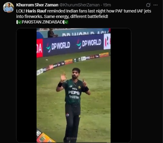 Another said, “LOL! Haris Rauf reminded Indian fans last night how PAF turned IAF jets into fireworks. Same energy, different battlefield! PAKISTAN ZINDABAD.”