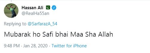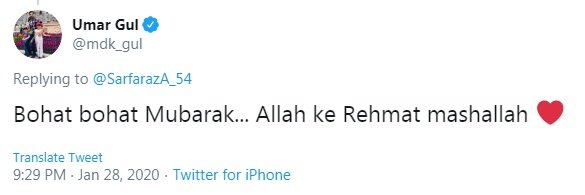 Other cricketers who sent their congratulations included Umar Gul, Hassan Ali and Shadab Khan.