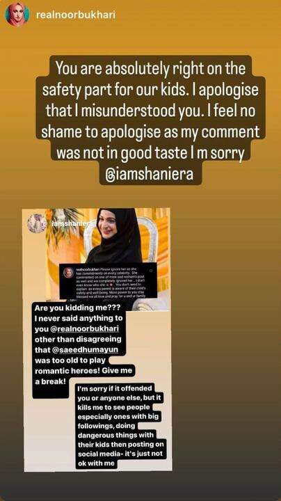 Later, Bukhari apologised to Akram while agreeing with the latter about the kids’ safety issue. “You are absolutely right on the safety part of our kids,” she shared on her Instagram story. “I apologise that I misunderstood you. I feel no shame to apologise as my comment was not in good taste. I’m sorry.”