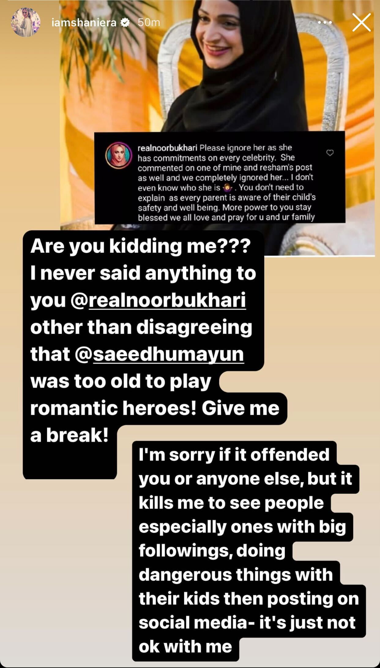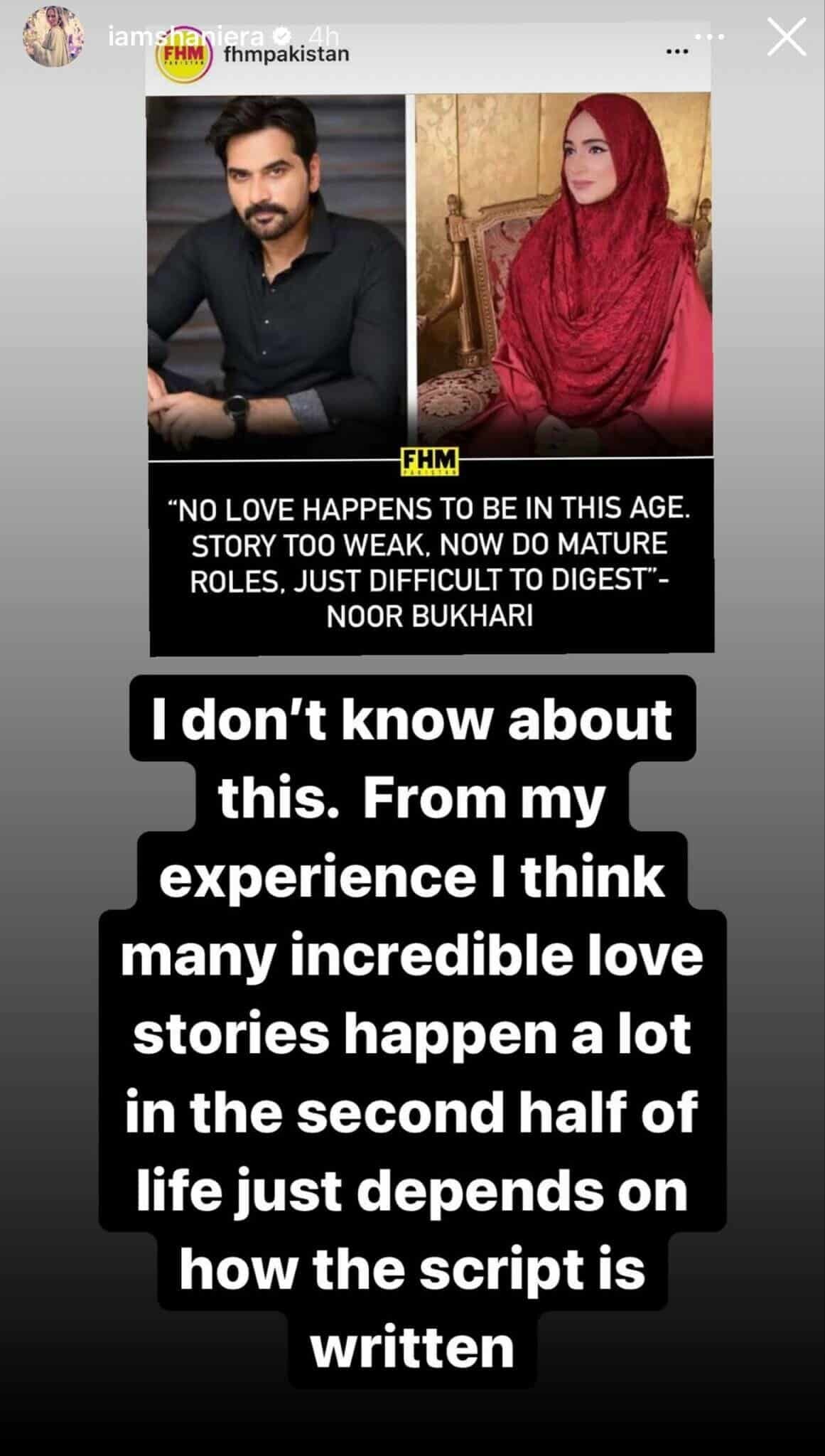 Akram then took to her Instagram story and addressed Bukhari’s criticism. “Are you kidding me?” the activist wrote. “I never said anything to you, Noor other than disagreeing that Humayun Saeed was too old to play romantic heroes. Give me a break.”