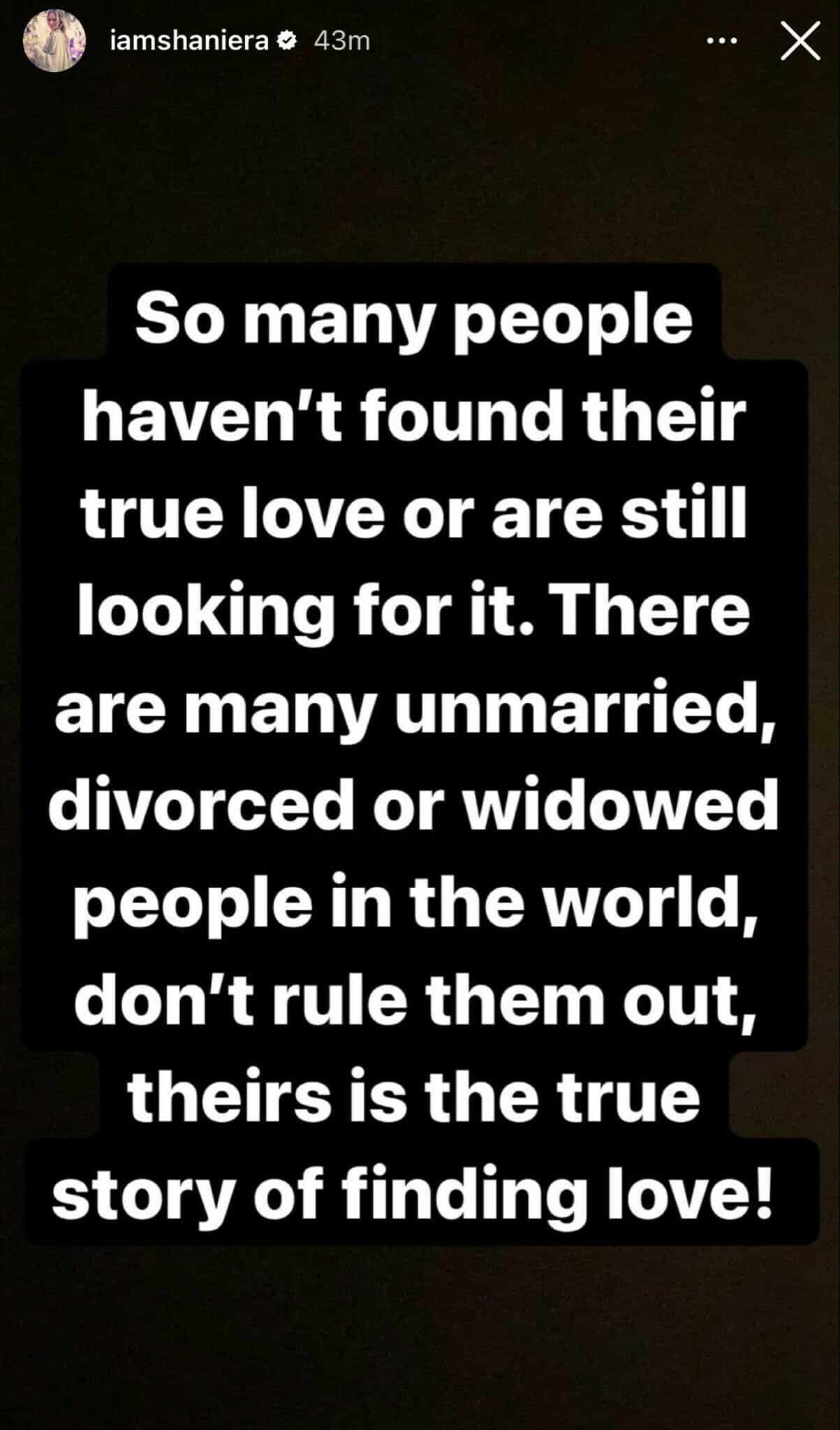 “So many people haven’t found their true love or are still looking for it. There are many unmarried, divorced [and] widowed people in the world — don’t rule them out. Theirs is the true story of finding love,” she wrote in her Instagram story.