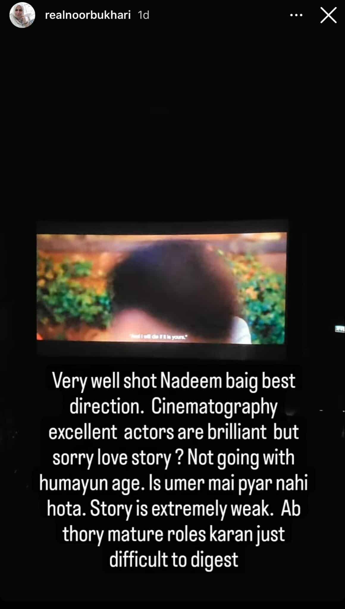 Taking to the Instagram story section, Noor said that the storyline of London Nahi Jaunga is extremely weak. She also took a jab at Humayun, believing he should be doing more mature roles. Bukhari added that “Love doesn’t happen in this age.”