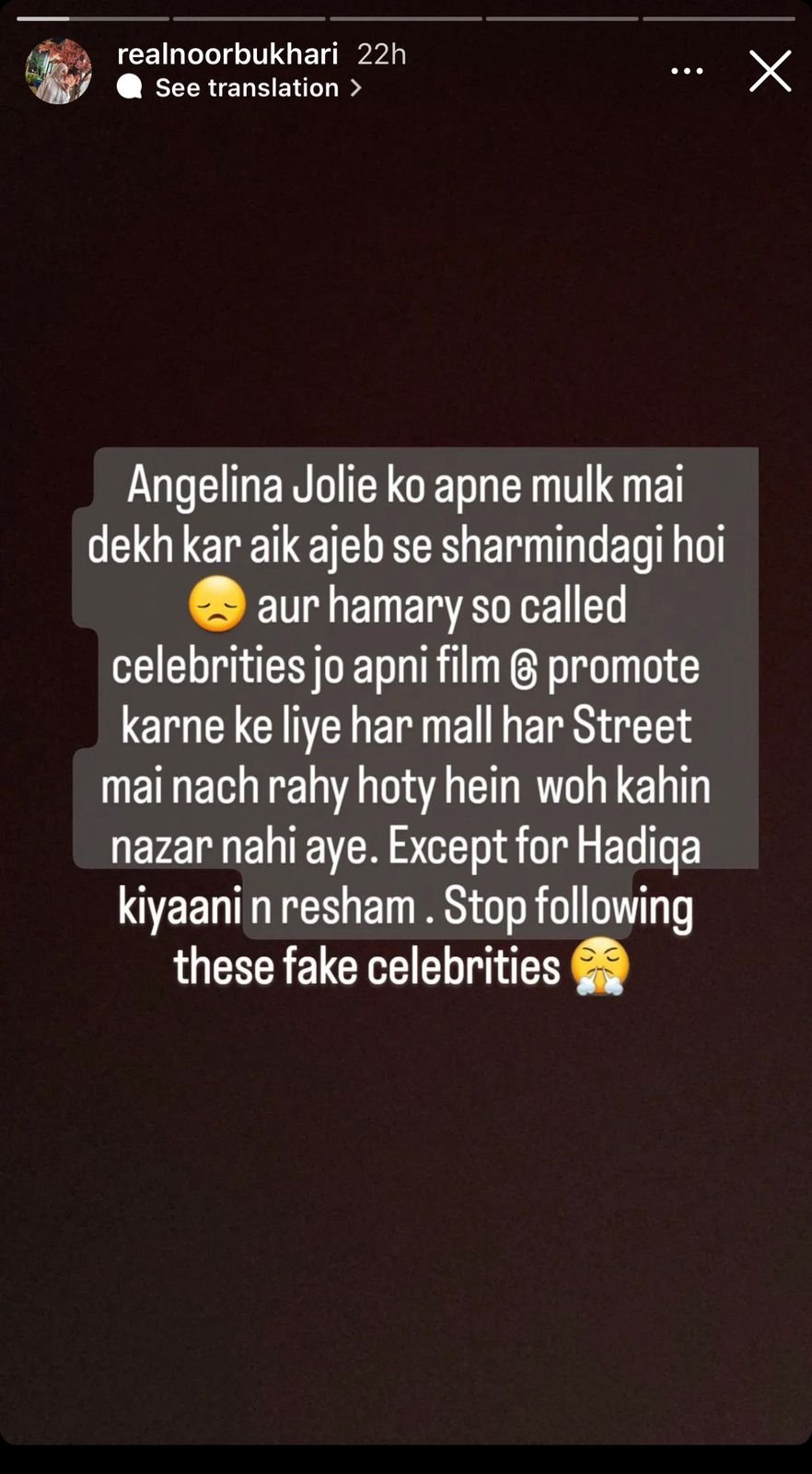 In an Instagram post, she shared pictures of several celebrities in Canada for the Hum TV Awards juxtaposed with photos of Hollywood actor Angelina Jolie in Pakistan.