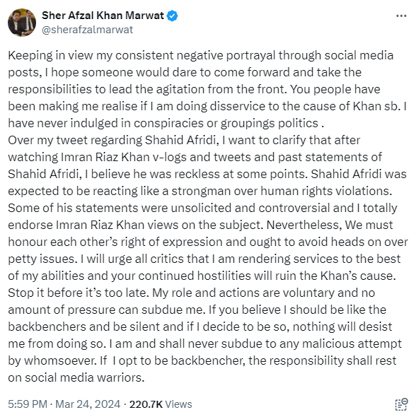 Pakistan Tehreek-e-Insaf (PTI) maverick leader Sher Afzal Marwat and the party’s social media team are facing off on the issue of criticism of former cricketer Shahid Afridi.
