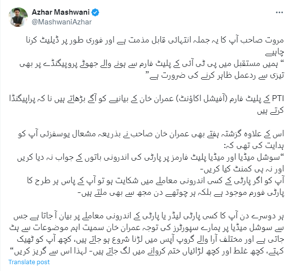 PTI’s social media activist Azhar Mashwani responded to Marwat’s statement about Shahid Afridi and said, “Marwat Sahib! This sentence of yours is reprehensible and should be deleted immediately, do not respond or comment on internal party talks on social media. You should avoid such action.”