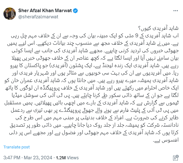 Sher Afzal Marwat wrote on X, “Why Shahid Afridi? Now a campaign is going on against Shahid Afridi due to an alleged statement on May 9. I saw few statements attributed to me against Shahid Afridi. So we should reject fake news. I have not come across any such statement from Shahid Afridi and it seems that some elements are spreading false news against him. Shahid Afridi is a living legend, a Pashtun (Afridi) who became the hero of Pakistan.”