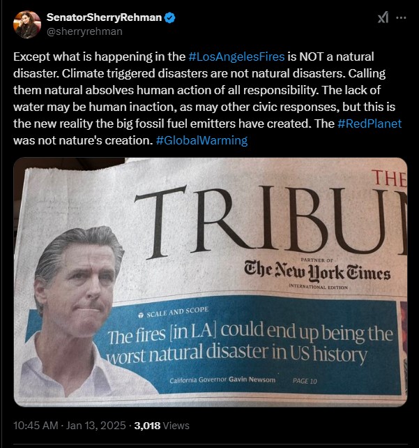 Senator Sherry Rehman, known for her advocacy on the effects of climate change, recently took to X (formerly Twitter) to criticise California Governor Gavin Newsom's statement about the LA fires.