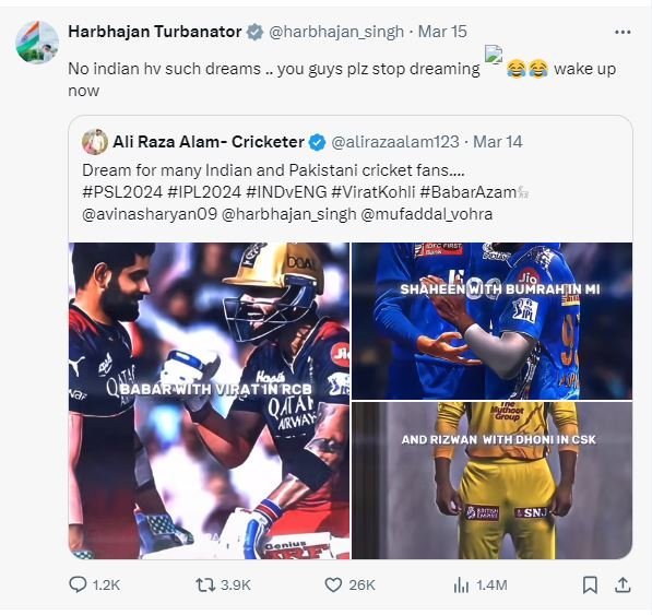 In response, Harbhajan wrote, “No Indian has such a dream, you should also stop dreaming and wake up.”