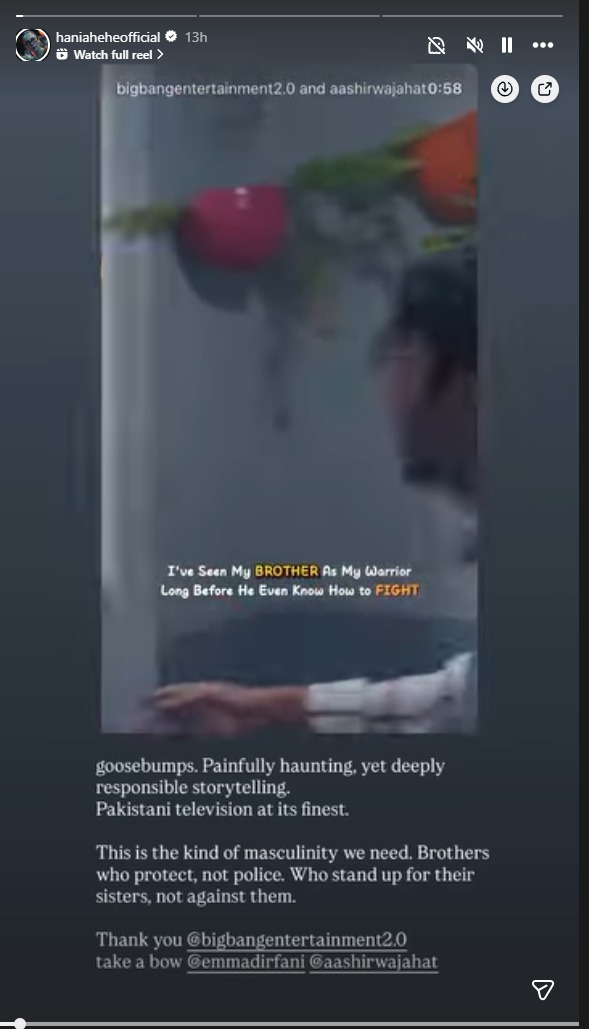 She shared a clip from episode 14 on her Instagram story and wrote, "Goosebumps. Painfully haunting, yet deeply responsible storytelling. Pakistani television at its finest. This is the kind of masculinity we need. Brothers who protect, not police. Who stand up for their sisters, not against them. Thank you @bigbangentertainment2.0 take a bow @emmadirfani @aashirwajahat."