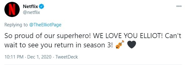 Netflix tweeted: “So proud of our superhero! We love you Elliot!”