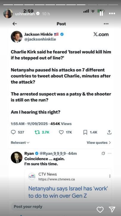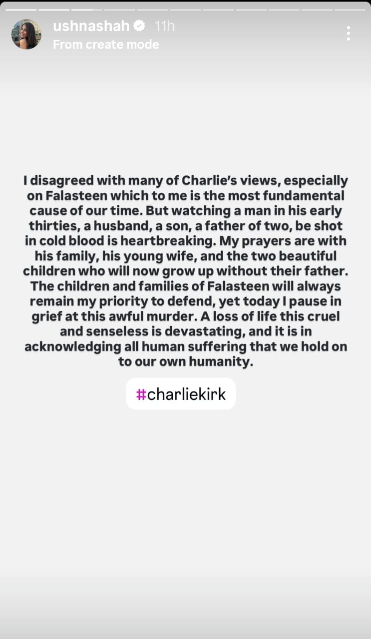 In an Instagram story, Shah wrote that although she found Kirk’s stance on Palestine to be deeply troubling, she was “heartbroken” to witness “a man in his early thirties, a husband, a son, a father of two, be shot in cold blood.”