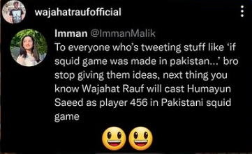 A netizen said: “To everyone who’s tweeting stuff like ‘if Squid Game was made in Pakistan.’ Bro stop giving them ideas, next thing you know Wajahat Rauf will cast Humayun Saeed as player 456 in Pakistani Squid Game.”