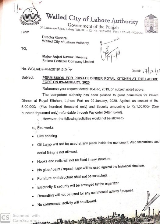 The permission letter, addressed to Major Asjad Nawaz Cheema, which is being circulated on social media clearly stated that fireworks, live cooking, hooks and nails among other things are strictly prohibited.