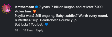 While responding to wish, Amaan Ahmed came up with quite a witty reply: “7 years, 7 billion laughs, and at least 7,000 stolen fries. Playlist wars? Still ongoing. Baby cuddles? Worth every round. Butterflies? Yup. Headaches? Double yup. But lucky? You bet.”