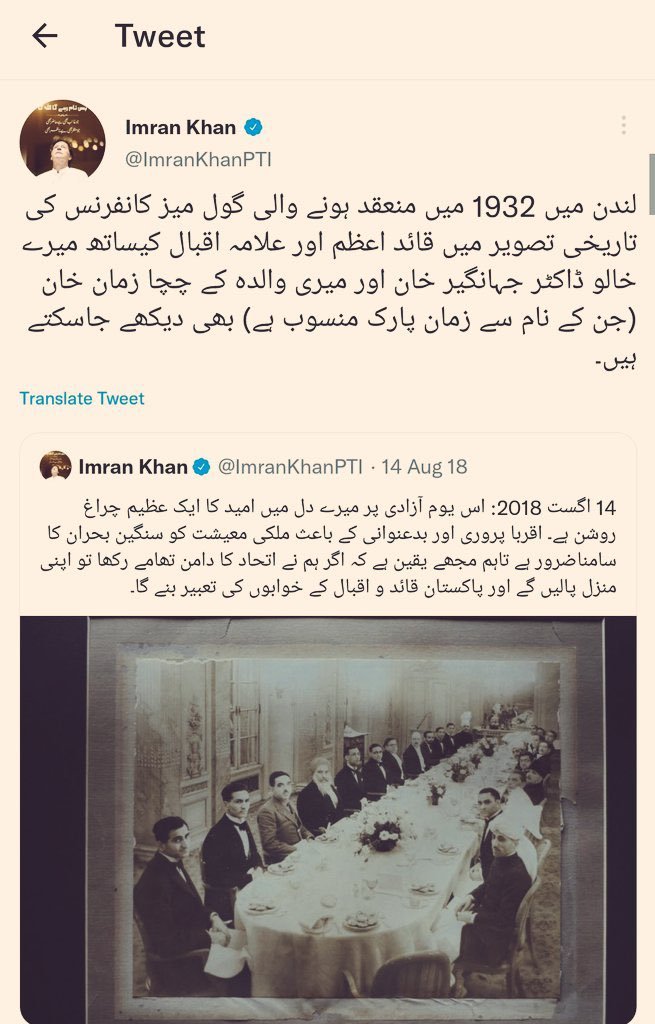 Khan posted a photograph on social media on August 8, and wrote: “The historic Round Table Conference London 1930 with both Quaid i Azam & Allama Iqbal present.”