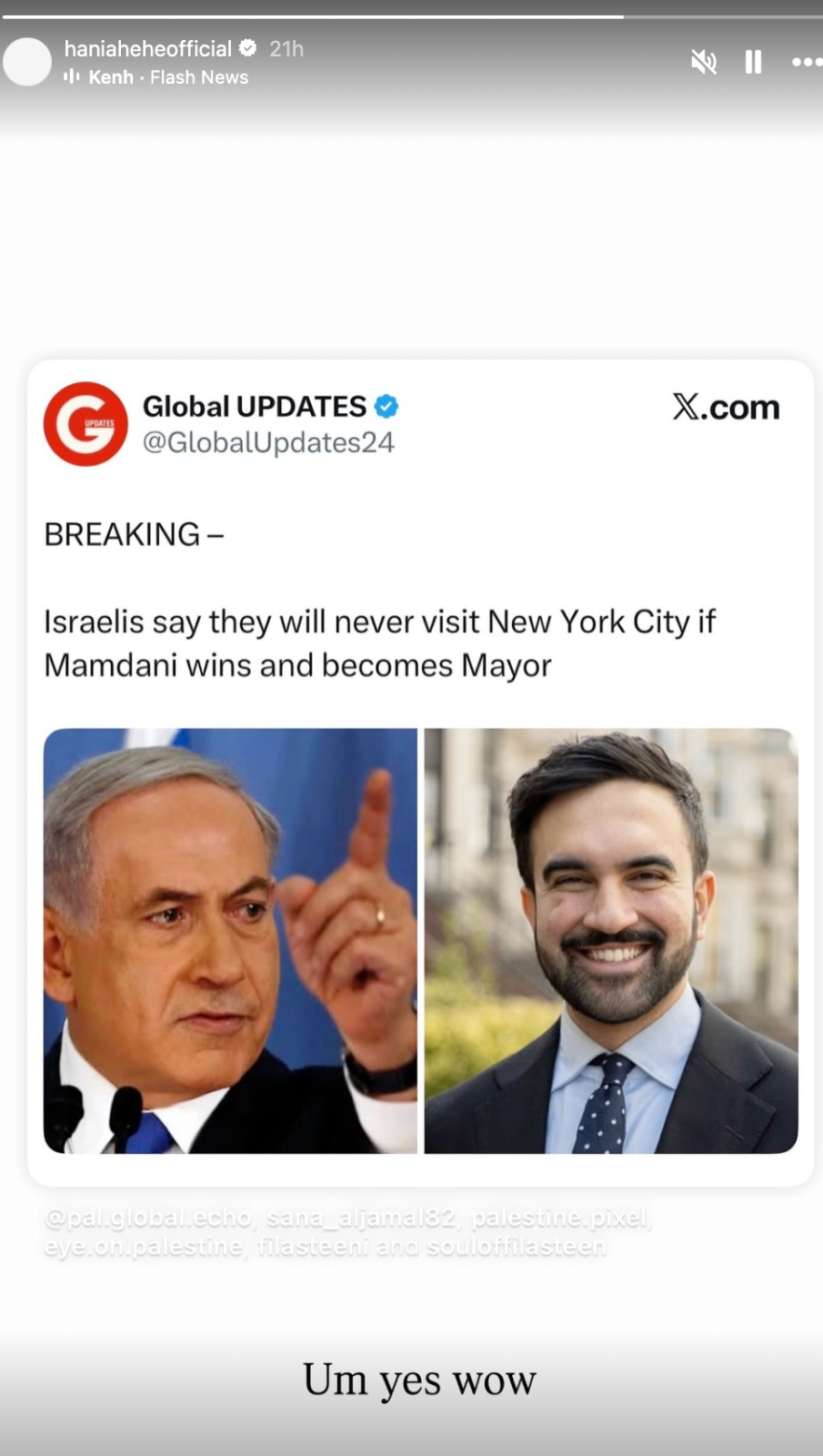 Meanwhile, across the Insta universe, it seems that Hania Aamir hasn’t heard her name being sung out with such intensity and has more pressing issues on her mind. The actor has been posting stories about New York’s new Mayor, Zohran Mamdani, with her latest story about how Israelis said they would not visit New York if Mamdani became mayor.