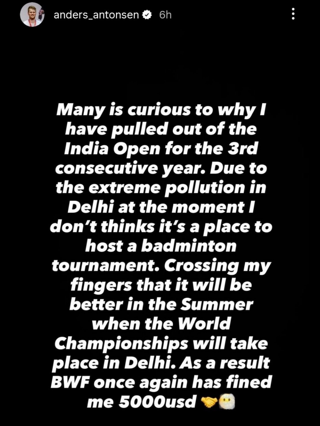 "Many is curious to why I have pulled out of the India Open for the third consecutive year. Due to the extreme pollution in Delhi at the moment I don't thinks it's a place to host a badminton tournament. Crossing my fingers that it will be better in the Summer when the World Championships will take place in Delhi. As a result BWF once again has fined me 5000 USD," Antonsen wrote on his Instagram story.