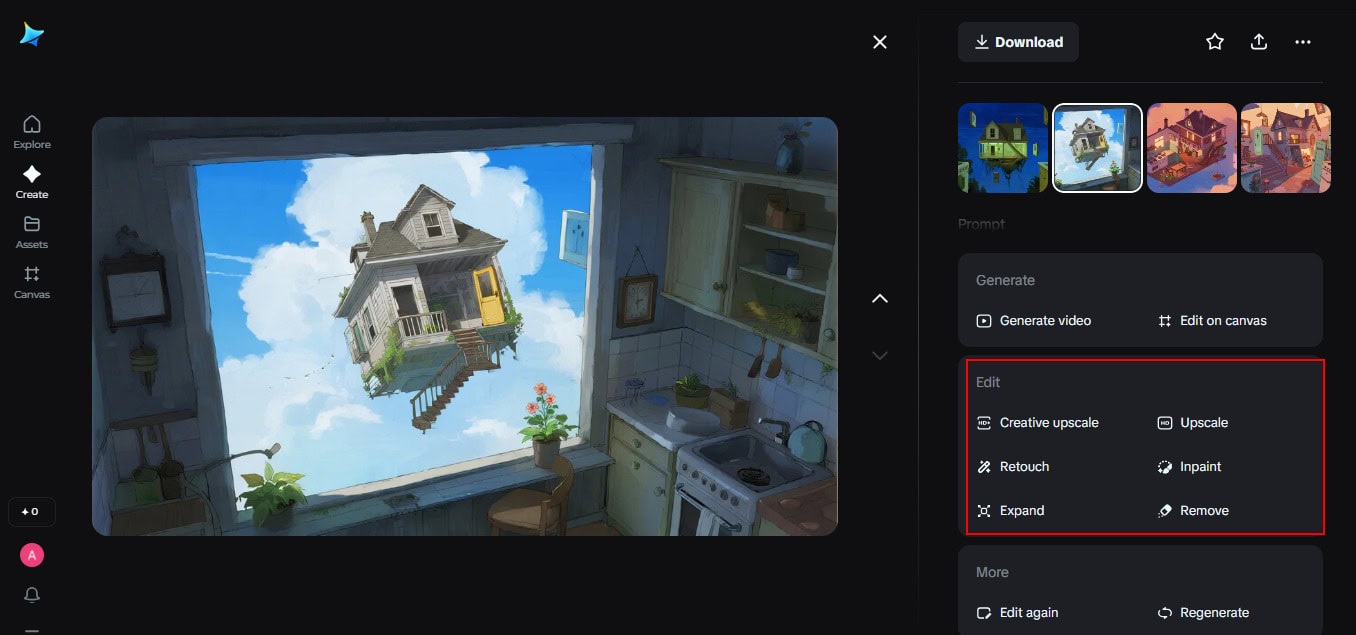 Once the image is up, you can refine it with Dreamina’s artistic features. Use inpaint to label emergency exits. Stretch the picture to display several configurations of a room. Delete elements that seem too cluttered and refine sections for clarity or artistic texture. When finished, click on “Download” and save your personalized emergency flip-map.