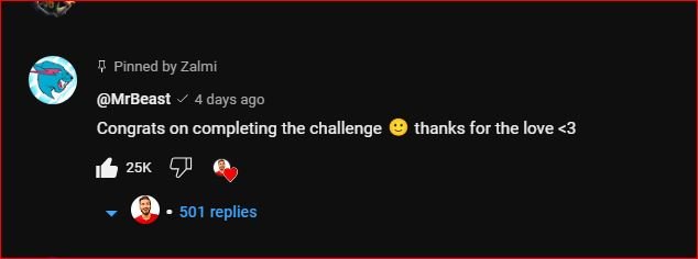 Zalmi completed the video challenge of 50 hours after which MrBeast commented on his video stating’ “Congrats on completing the challenge, thanks for the love”.
